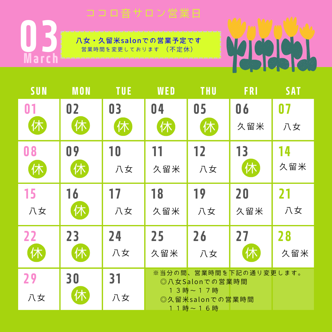 当分の間、営業時間を下記の通り変更致します。 八女salon 13時~17時 久留米salon 11時~16時 (令和8年3月より) |
